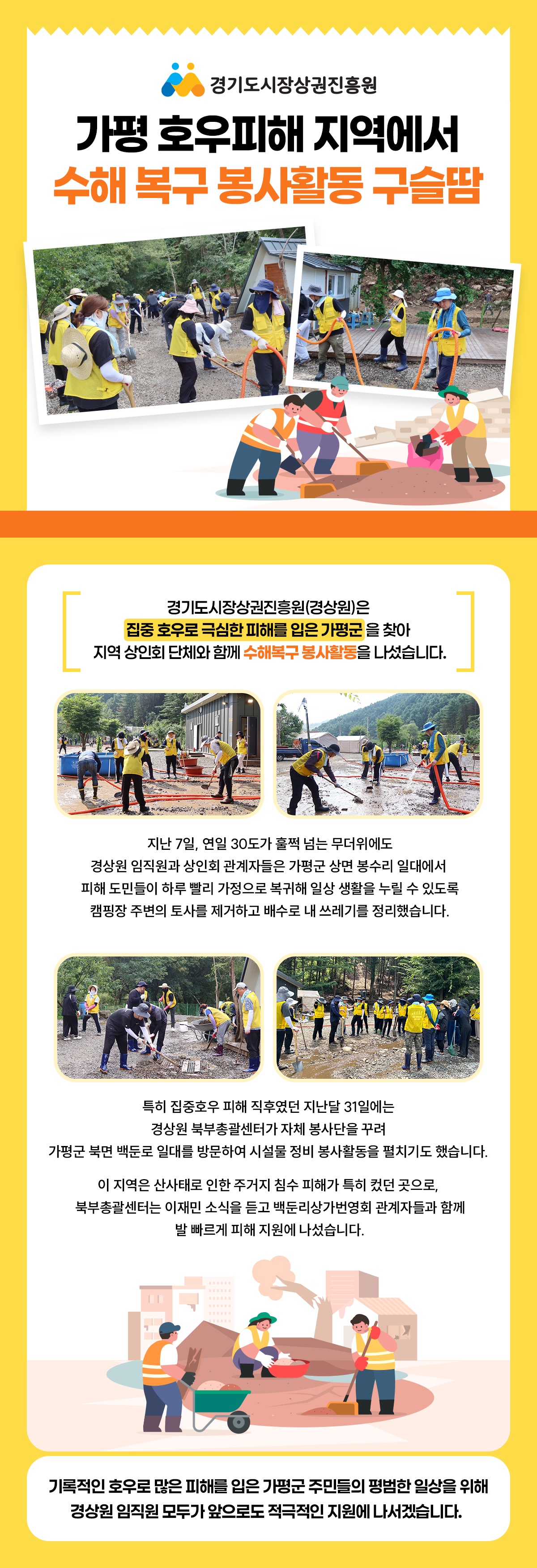 경기도시장상권진흥원은 가평 지역의 호우피해 복구 현장에서 수해 복구 봉사활동을 펼치며 구슬땀을 흘렸습니다.