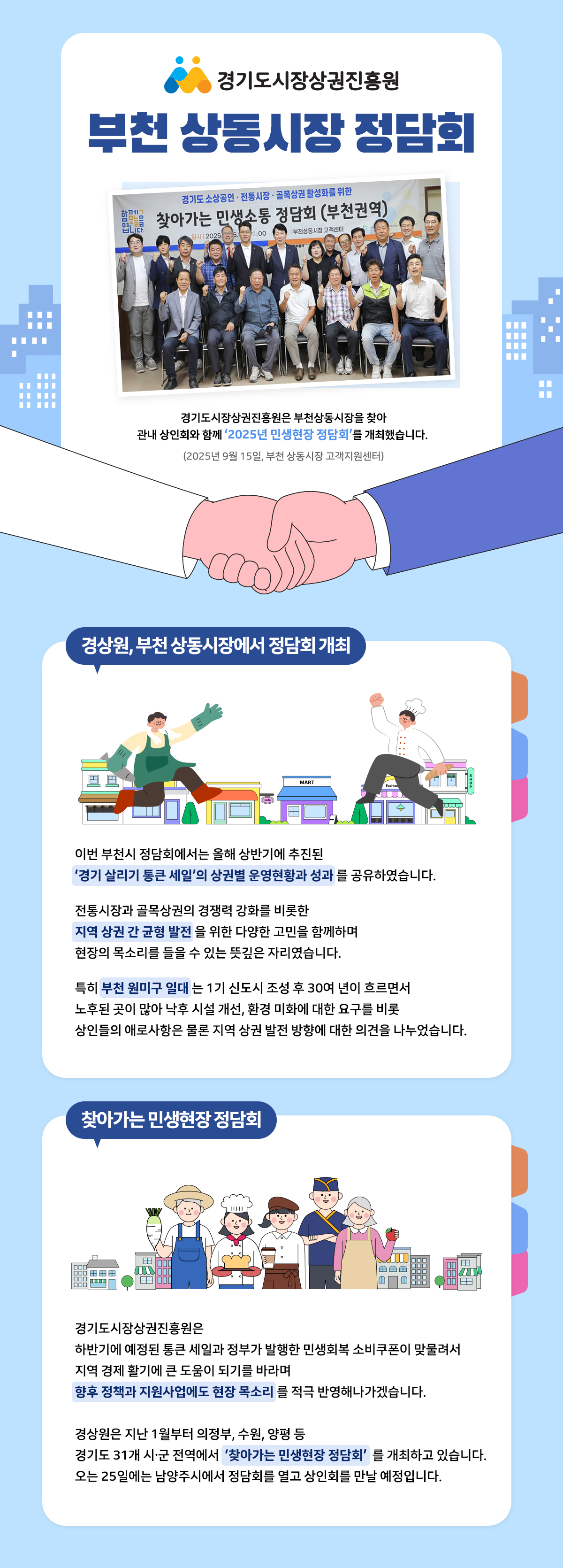 경기도시장상권진흥원은 부천 상동시장에서 상인회와 함께 민생현장을 살피고 소통하기 위한 ‘정담회’를 개최하였습니다. 이번 자리는 지역 상인들의 애로사항을 직접 청취하고, 상권의 현안 및 발전 방향을 논의하기 위해 마련되었습니다.