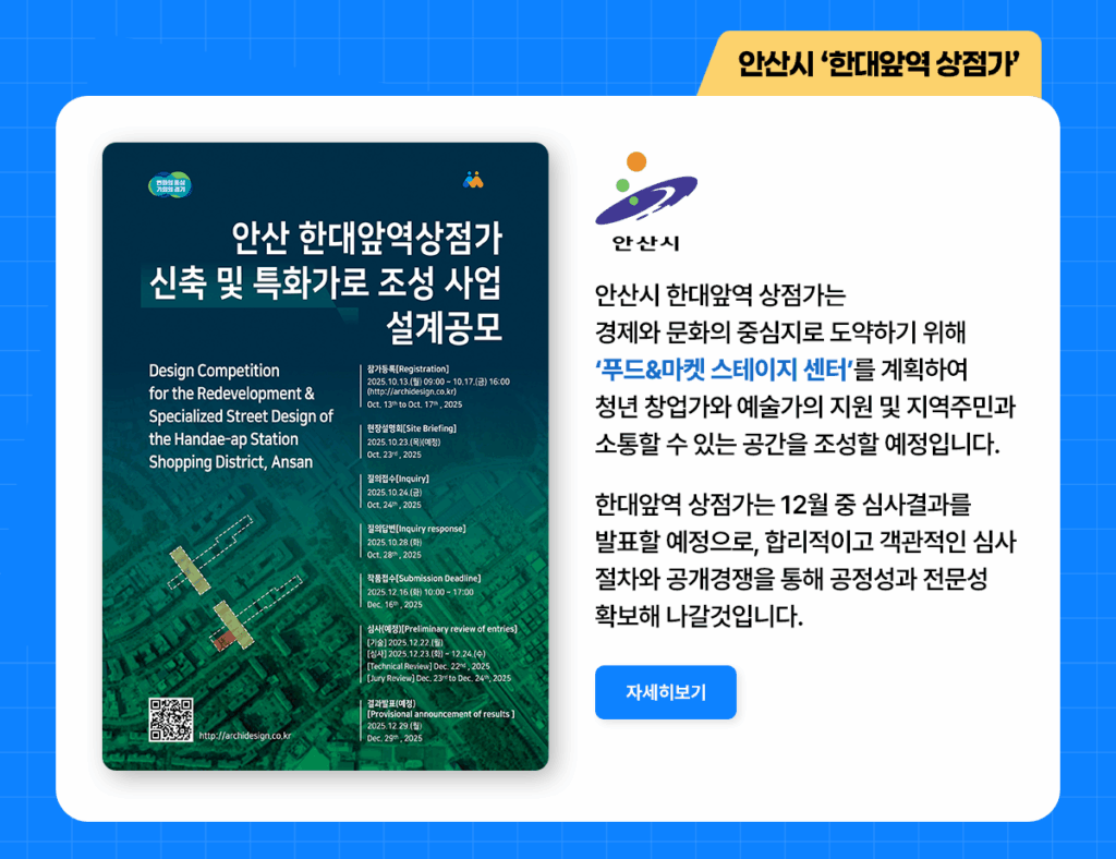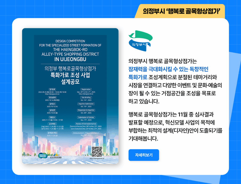 공모 대상은 안산시 ‘한대앞역 상점가’ 및 **의정부시 ‘행복로 골목형상점가’**이며, 이들 지역에 경기도형 전통시장 혁신모델을 조성하기 위한 설계안을 공모합니다.