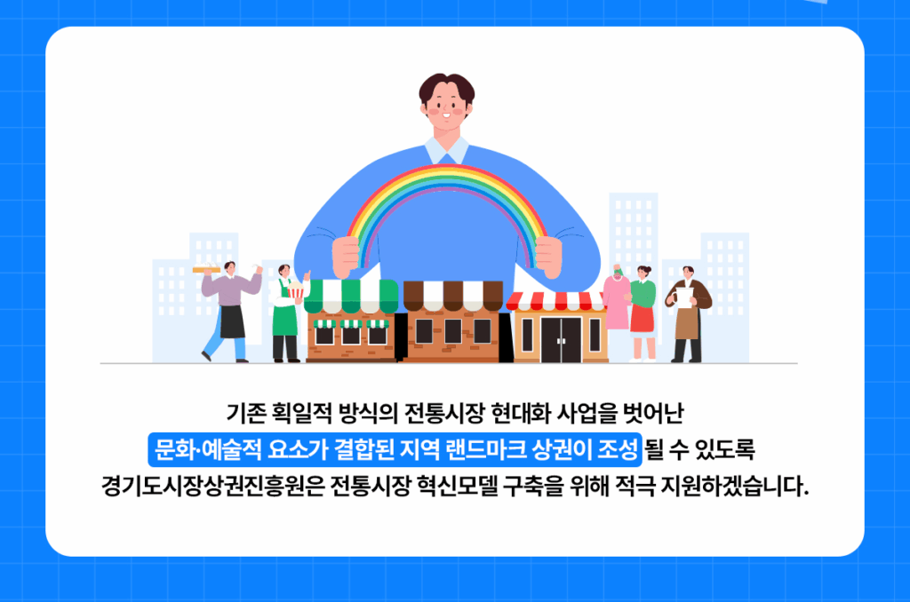 경기도 소상공인과 관계자는 “전통시장이 단순한 유통 공간을 넘어 지역문화와 공동체가 살아 숨 쉬는 혁신적 생활 거점으로 변화하는 계기가 되기를 기대한다”고 밝혔습니다.